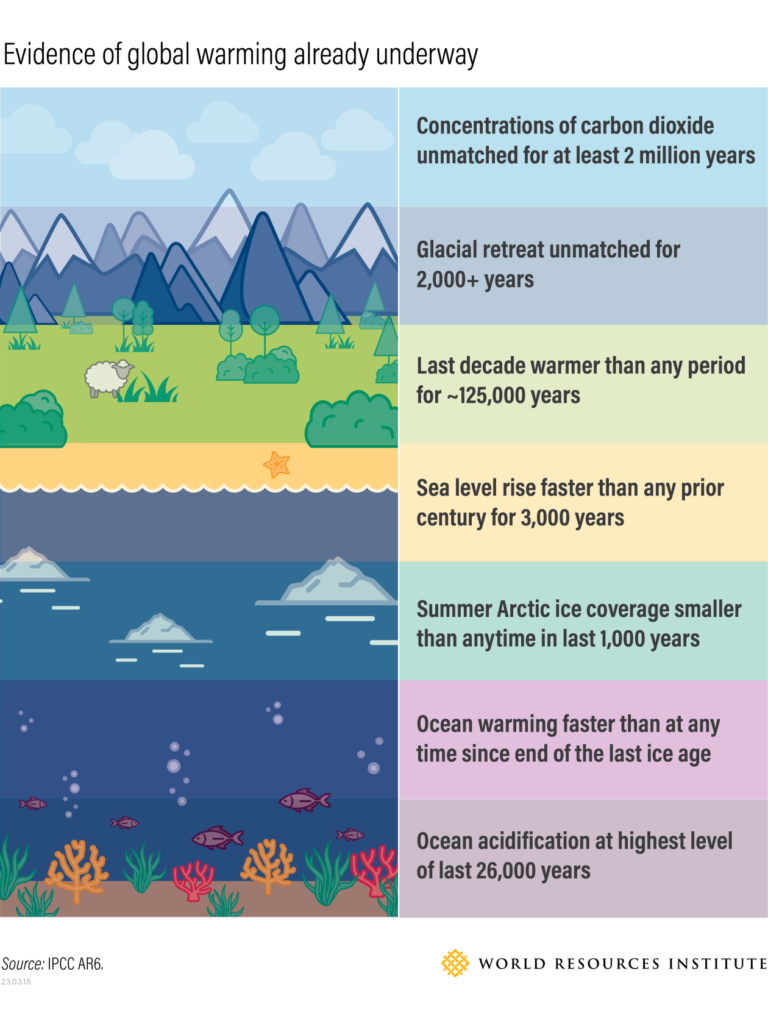 Già, con l’aumento della temperatura globale di 1,1 gradi C (2 gradi F), cambiamenti del sistema climatico senza precedenti nel corso dei secoli e dei millenni si stanno verificando in ogni regione del mondo, dall’innalzamento del livello del mare agli eventi meteorologici più estremi fino alla rapida scomparsa mare ghiacciato.